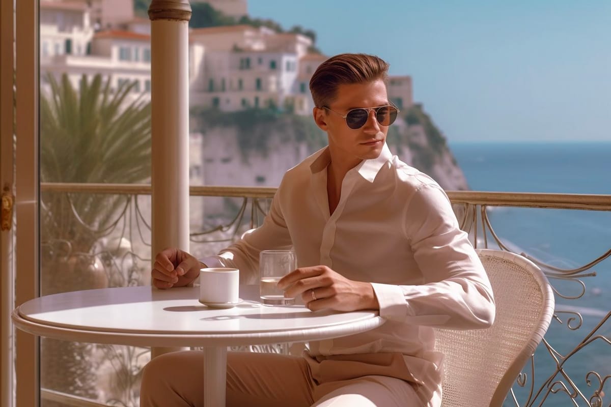 Midjourney Prompt - realistic street style photo , 35 mm lens, man sips an espresso and looks out over the sea, wearing elegant white linen clothing at a chic outdoor cafe in Monaco, sophisticated atmosphere, shot on Sony aiii high resolution digital camera, hyper realistic skin, global illumination, very natural features, f/1.8 --uplight --ar 3:2