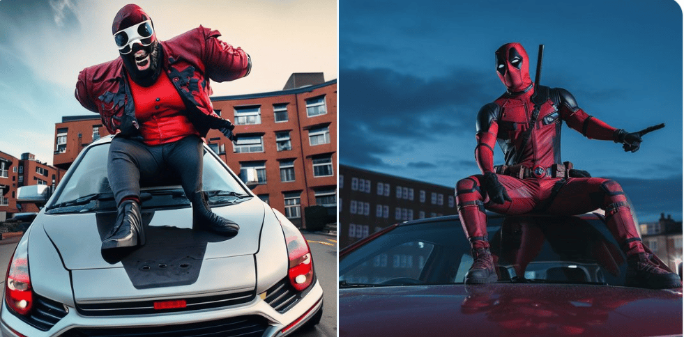 Midjourney Prompt - Deadpool wide angle pose on top of a car outside an apartment complex in the uk, canon, vlogger, --v 5 --q 2 --ar 3:2